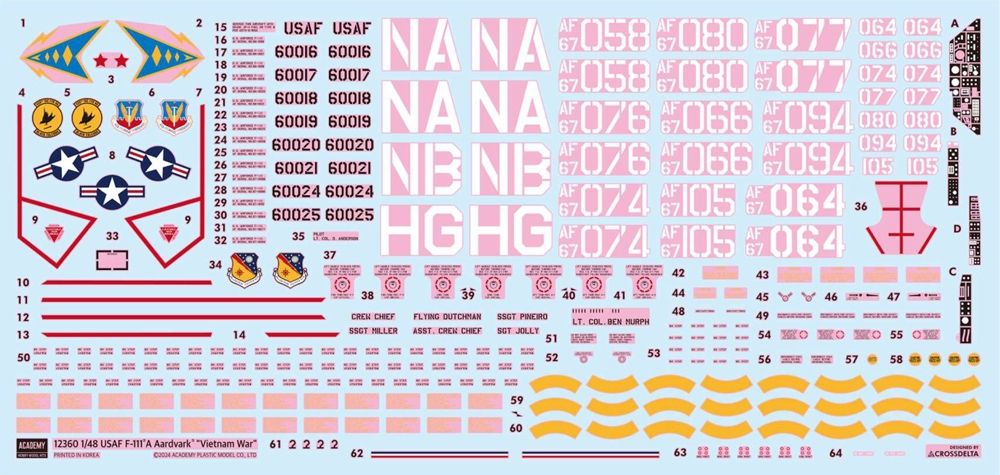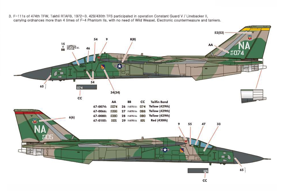 7 sprues. Improved nose gear parts. Air-to-ground weapons & metal pitot tube included. Choice of 4 markings: (1) F-111As of Det 1, 428th TFS, 474th TFW at Operation Combat Lancer, Takhli RTAFB, 1968. 66-0018 was the mount of the commander Lt Col Benjamin C Murph. Crew names were applied on their way back to the US; (2) F-111As of 429th TFS, 474th TFW, Nellis AB, Nevada, 1971. 67-0058 is a mount of C.O. Lt Col Robert D Anderson with two red stars from his two MiG kills by F-4C, Vietnam 1967; (3) F-111s of 3474th TFW, Takhli RTAFB, 1972-73. 429/430th TFS participated in Operation Constant Guard V / Linebacker II carrying ordnance more than 4 times that of F-4 Phantom IIs with no need for Wild Weasel, electronic countermeasure or tankers; (4) F-111s of 429/430th TFS, Takhli RTAFB, 1973. 347th TFW took command of these units with new tailcode of HG, and flew combat missions until its deactivation in June 1975 at Korat RTAFB.