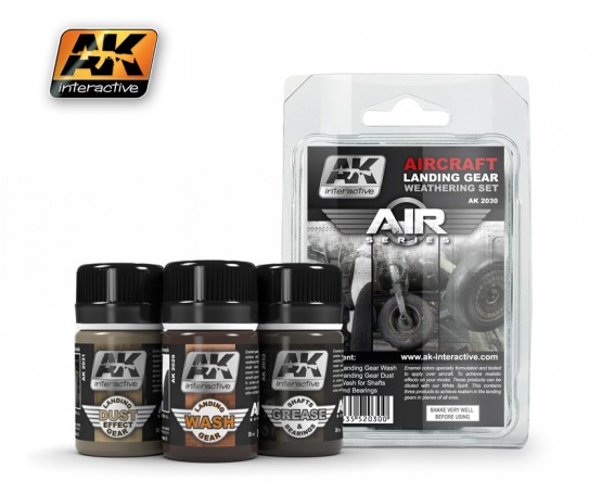 This weathering set belongs to our new Air Series line. This specific set focuses on the weathering of aircraft landing gear. This set has been specially formulated by our art department to achieve maximum realism on your models. These products can be dissolved with our white spirit if needed. This set includes three colours:AK2029 Landing Gear Wash, AK2031 Landing Gear Dust, and AK2032 Grease Shafts and Bearings.