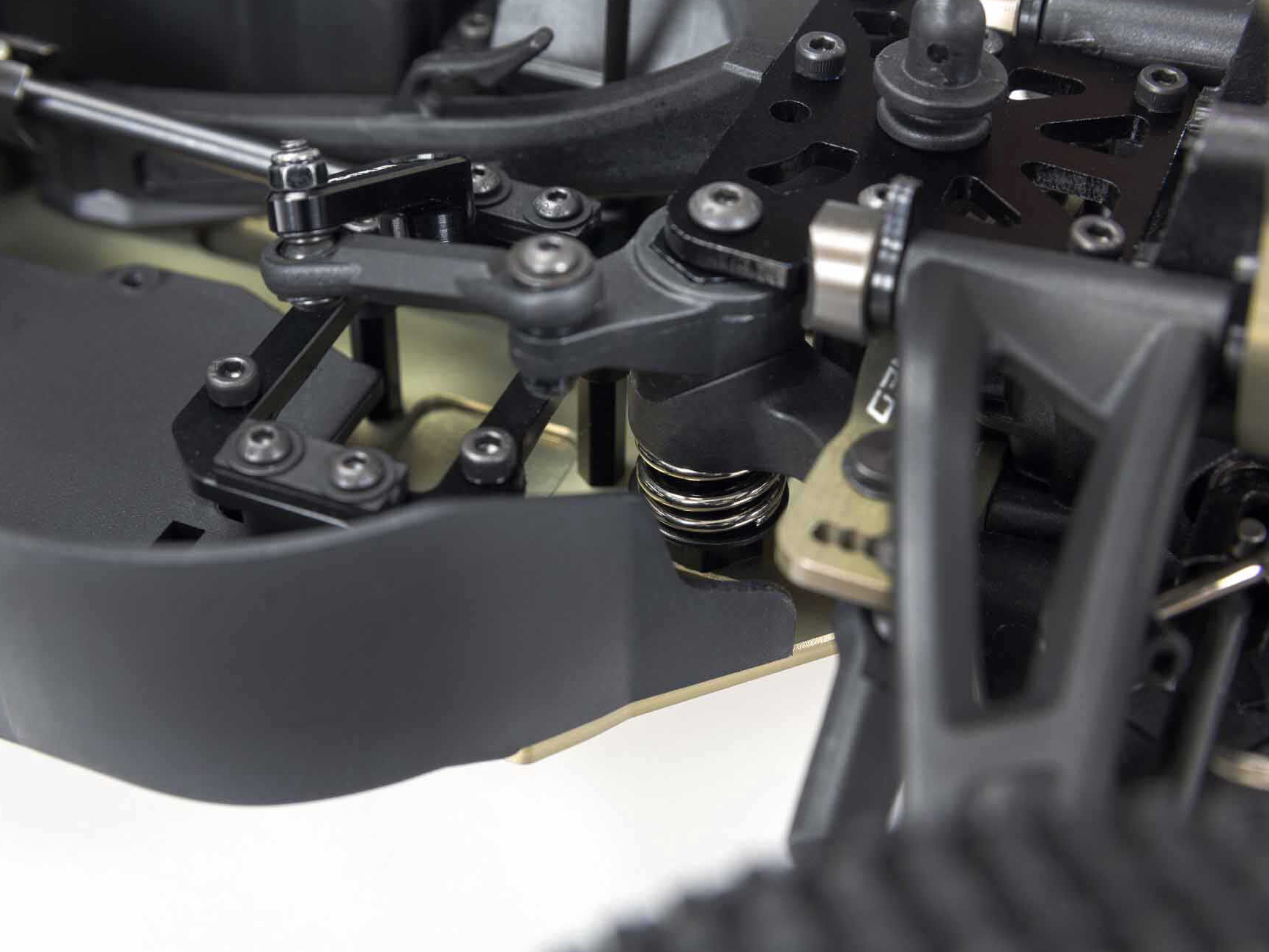 The durable TLR® Tuned aluminium upgrades include the chassis plate, steering rack, adjustable upper and lower suspension hangers, shock bodies, and front and rear shock towers. All are laser-etched with the TLR® Tuned logo. The chassis also features strong composite side pods and front and rear braces. The oil-filled, adjustable shocks have machined tapered pistons and Extreme Bash (EXB) stand-offs.