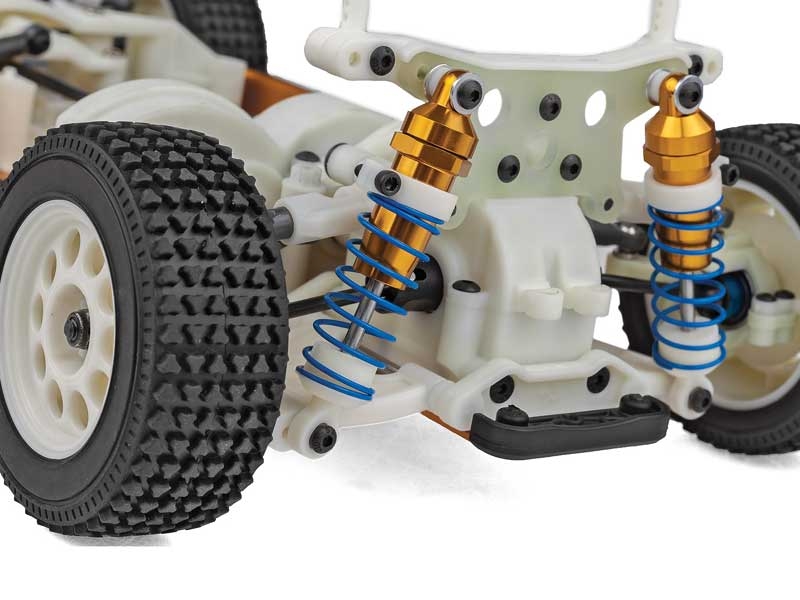 Bring the golden era of RC racing into the modern age with this rally-bred powerhouse, outfitted with a new aluminum gold tub chassis plate and iconic RC10 livery decal sheet. The clear 3-piece rally body set, complete with rear bumper and wing, delivers aggressive styling and aerodynamic performance, while injection-molded brake calipers and rotors add realistic scale detail. New rally shock towers, gold anodized aluminum shocks, and a fully adjustable front suspension with upgraded upper arms and turnbuckle set give you the precision handling needed to dominate any surface.