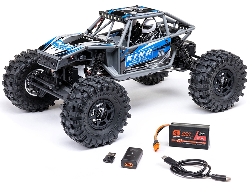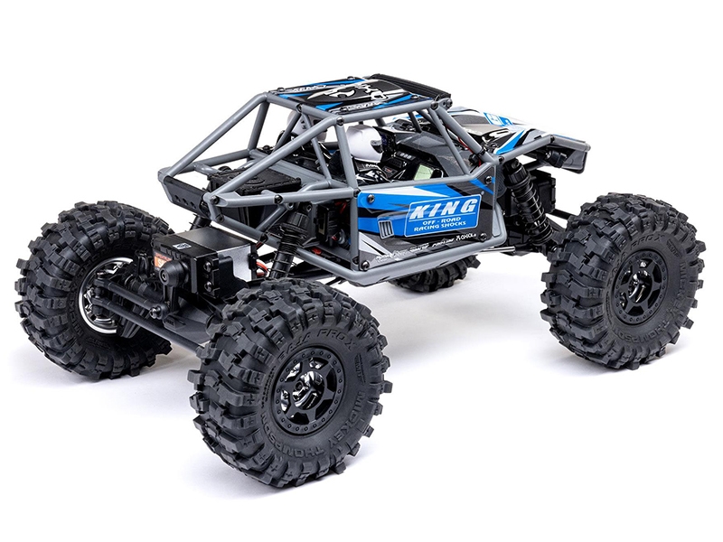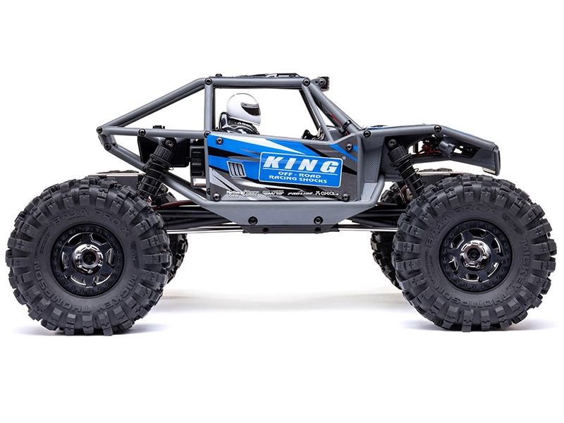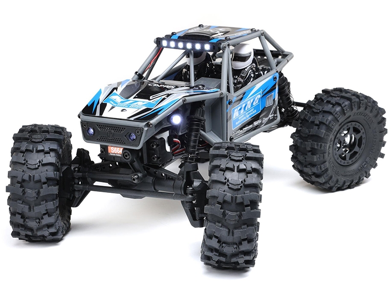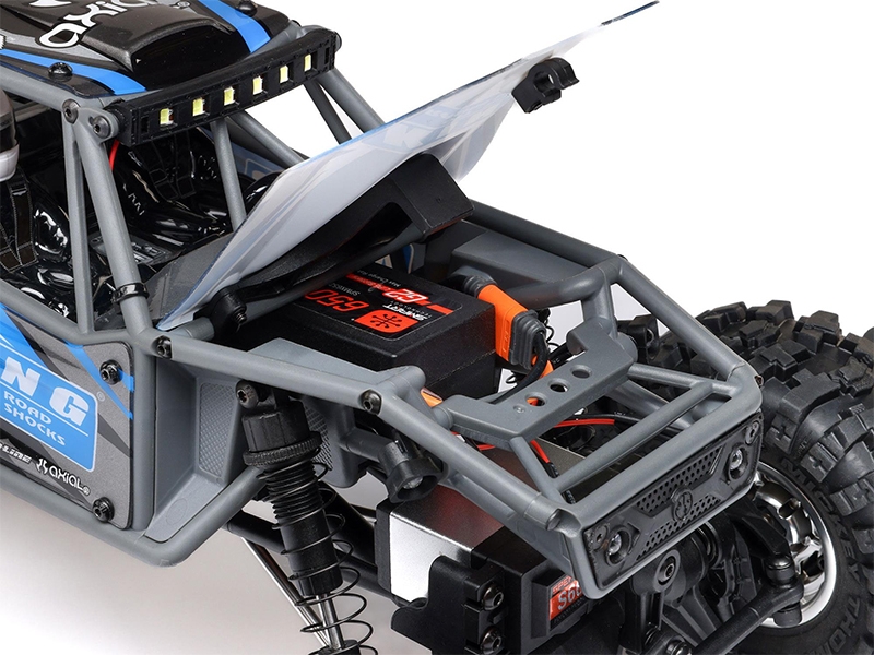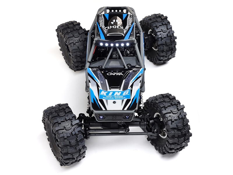 The scaled-down Capra tube chassis adds realistic trail buggy looks, with helmeted driver and passenger figures, LED headlights, rock lights, and light bar. Choose from two new paint scheme and livery options. One has a gray cage and blue body panels with licensed King Shocks livery. The other has a black cage and yellow body panels with licensed Mickey Thompson Tire livery.