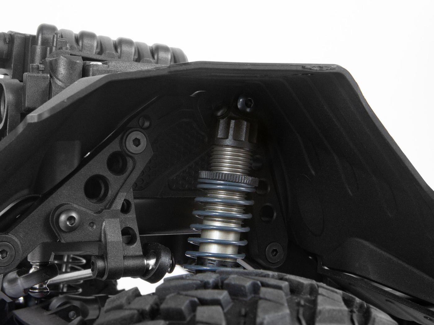 Injection-moulded inner fenders hide internal components usually visible from the side of the chassis.