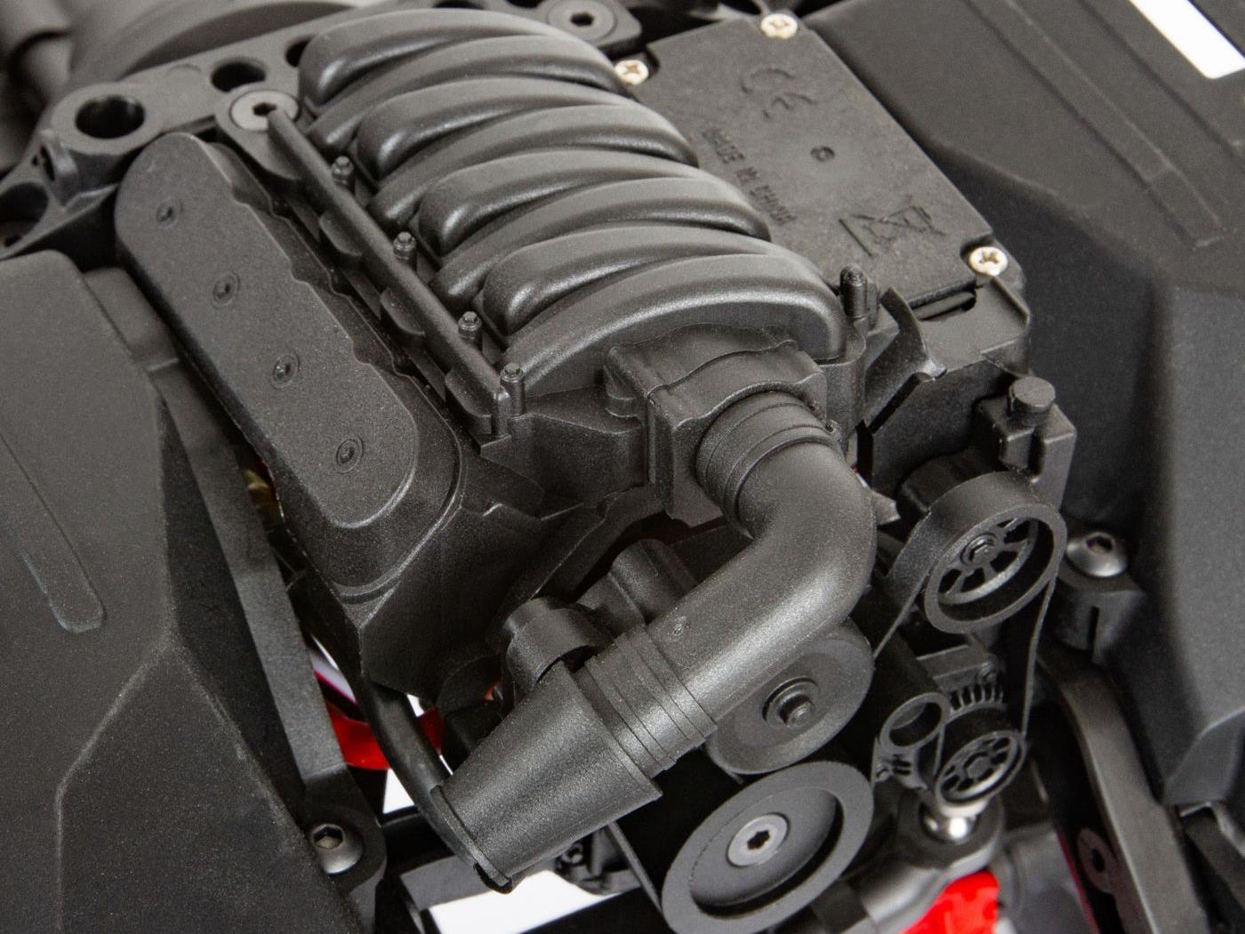 The V8 engine cover protects the 540-size motor and is mated to a scale transmission housing. In addition to offering motor protection and realistic looks, the design gives the chassis forward-mounted weight.