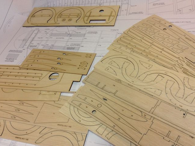 The Belair Parts set is full of intricate laser cut parts in balsa and plywood, including fuselage parts, bulkhead, formers, cowl parts, wing ribs, shaped trailing edges with rib slots cut, tail parts, servo plates, tail skid, fuselage crutch parts.