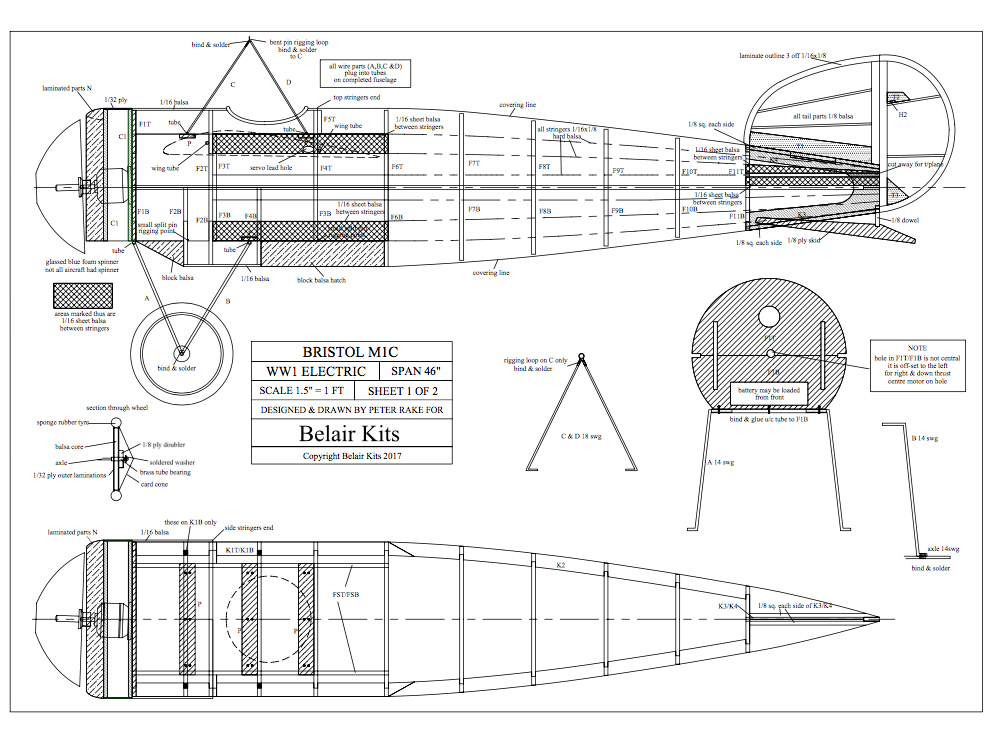 Bristol M1C Another iconic model from WW1 designed for Belair by Peter Rake. Modelled at 1.5″:1′, this 46 inch model suits 480 size brushless (150w) setups.