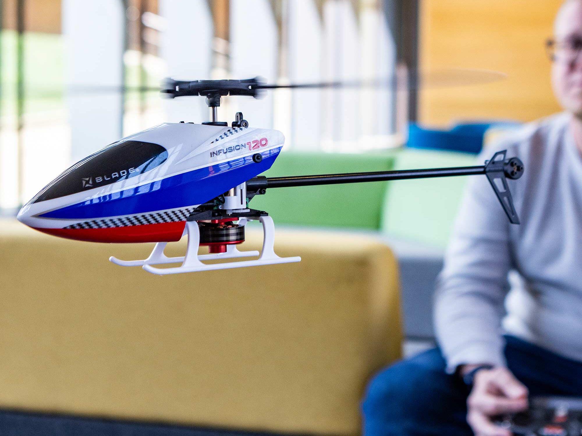 The Blade InFusion 120 helicopter features exclusive SAFE® (Sensor Assisted Flight Envelope®) technology, a revolutionary electronic flight envelope protection system that makes it easy for anyone to fly helicopters with confidence by providing flight mode versatility and Panic Recovery mode that automatically returns the heli to a level attitude.