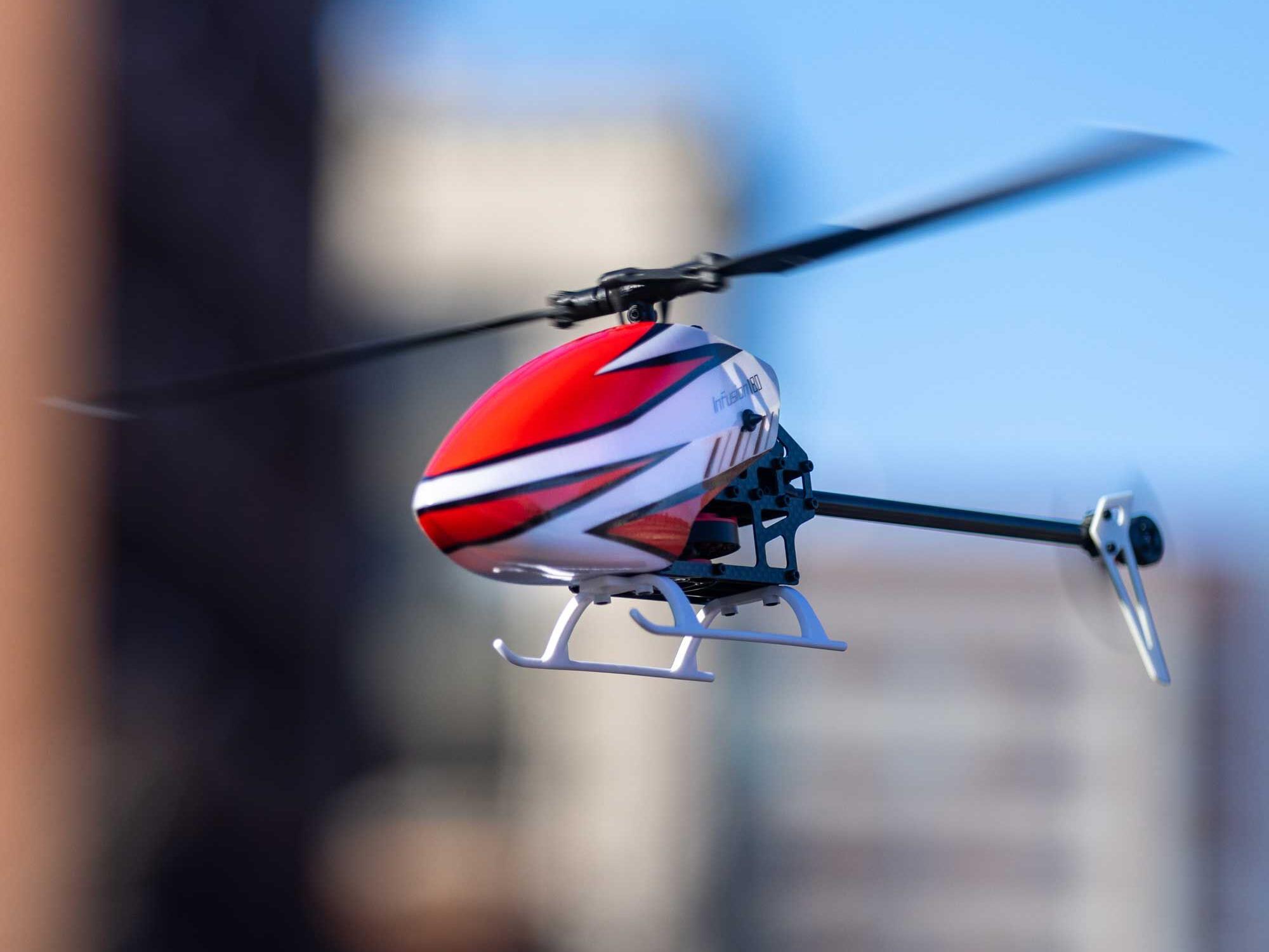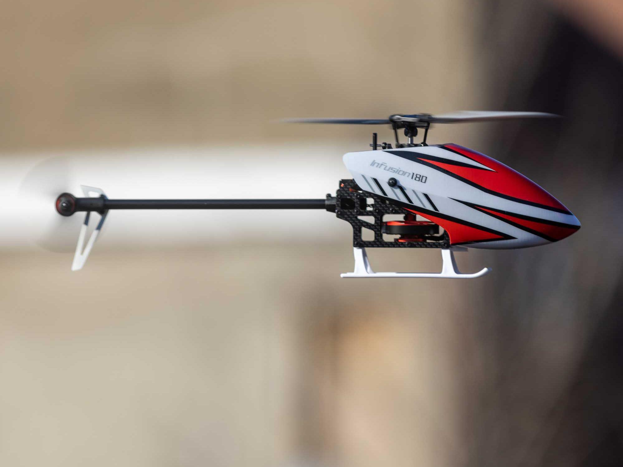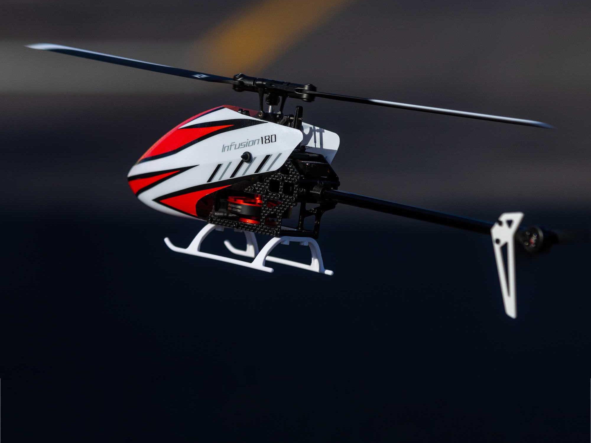 The Blade® InFusion 180 is a new design from the Blade team engineered for next-level durability and performance. Featuring an oversized direct-drive power system, no gears are driving the main rotor, allowing for instant power and lower parts count. For those looking for high performance in a small size, the InFusion 180 packs a punch perfect for thrilling backyard aerobatics. The InFusion 180 is easy to see while tearing up the sky with a one-piece canopy, bright white tail fin, and main landing gear. Featuring the latest in Spektrum™ Technology, it is equipped with the micro AR6251MHX Flight Controller that is expertly tuned out of the box yet remains adjustable for pilots to fine-tune the aircraft to their flying style. Also, a Spektrum Smart Avian™ ESC offers precise head speed control for a high-performance flight that doesn’t lag. Additionally, an innovative fusion of carbon fibre, ABS plastic, and aluminium components delivers outstanding rigidity and durability. With BNF® Basic convenience, all you have to do is add a 3S 600mAh battery, bind your 6+ channel Spektrum DSMX® transmitter, and take it to the skies.
