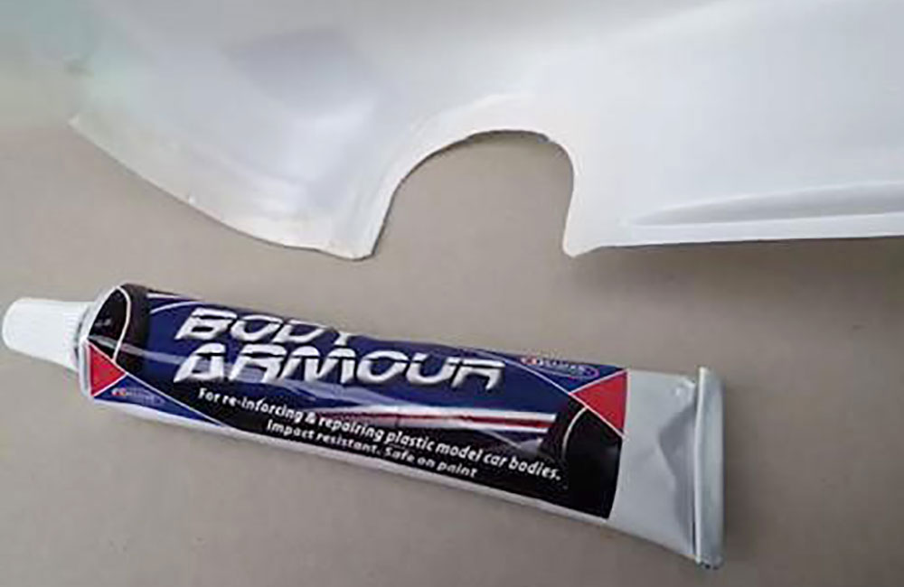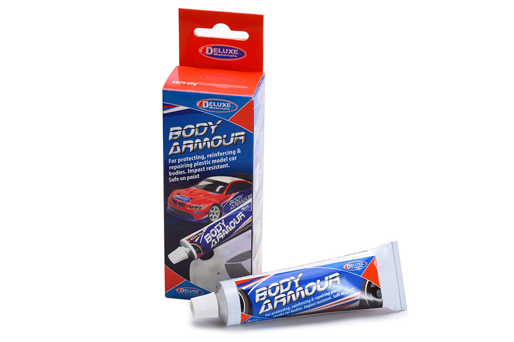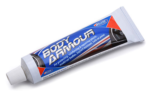 Deluxe Materials Body Armour is a highly flexible polymer adhesive specially designed for reinforcing & repairing model car bodies subject to the arduous conditions of model car competition. Its dries flexible making it ideal for protecting & repairing splits in model car bodies. It bonds most car body plastics including Lexan, polycarbonate & styrene & will not attack most common model car paints.