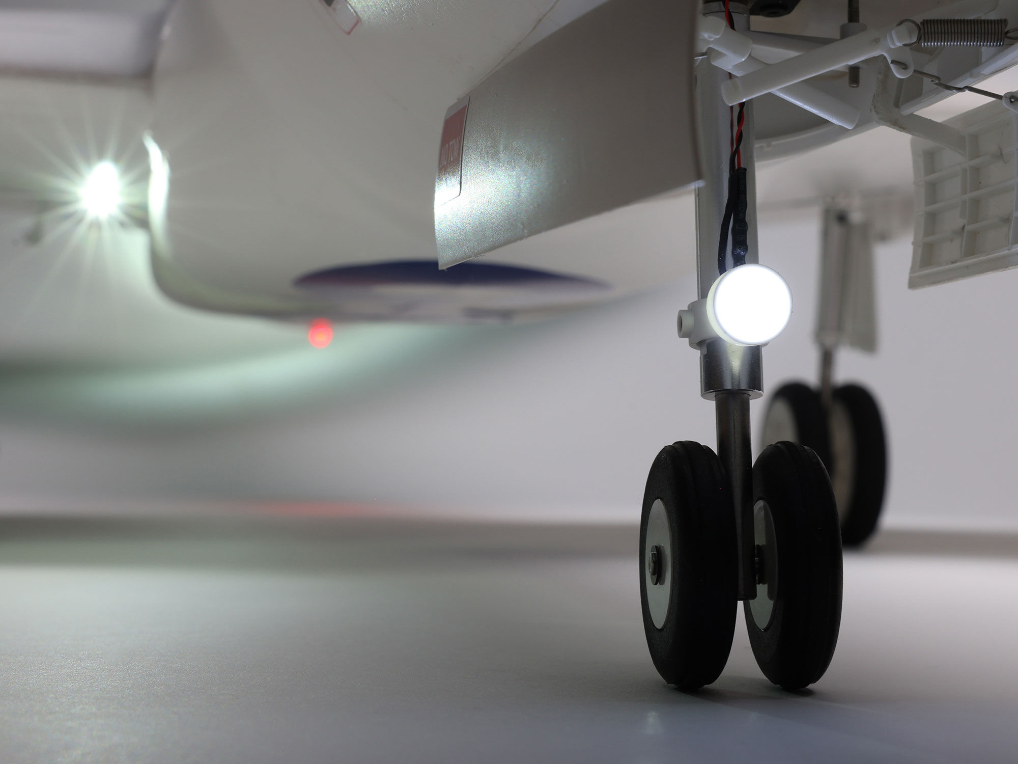 The factory-installed electric retracts are equipped with durable metal components including shock-absorbing struts that make it possible to fly from a variety of surfaces including paved and fabric runways, packed dirt and some grass fields. Wide-spaced main gear plus a steerable nose wheel, all with dual wheels, offers excellent ground handling.
