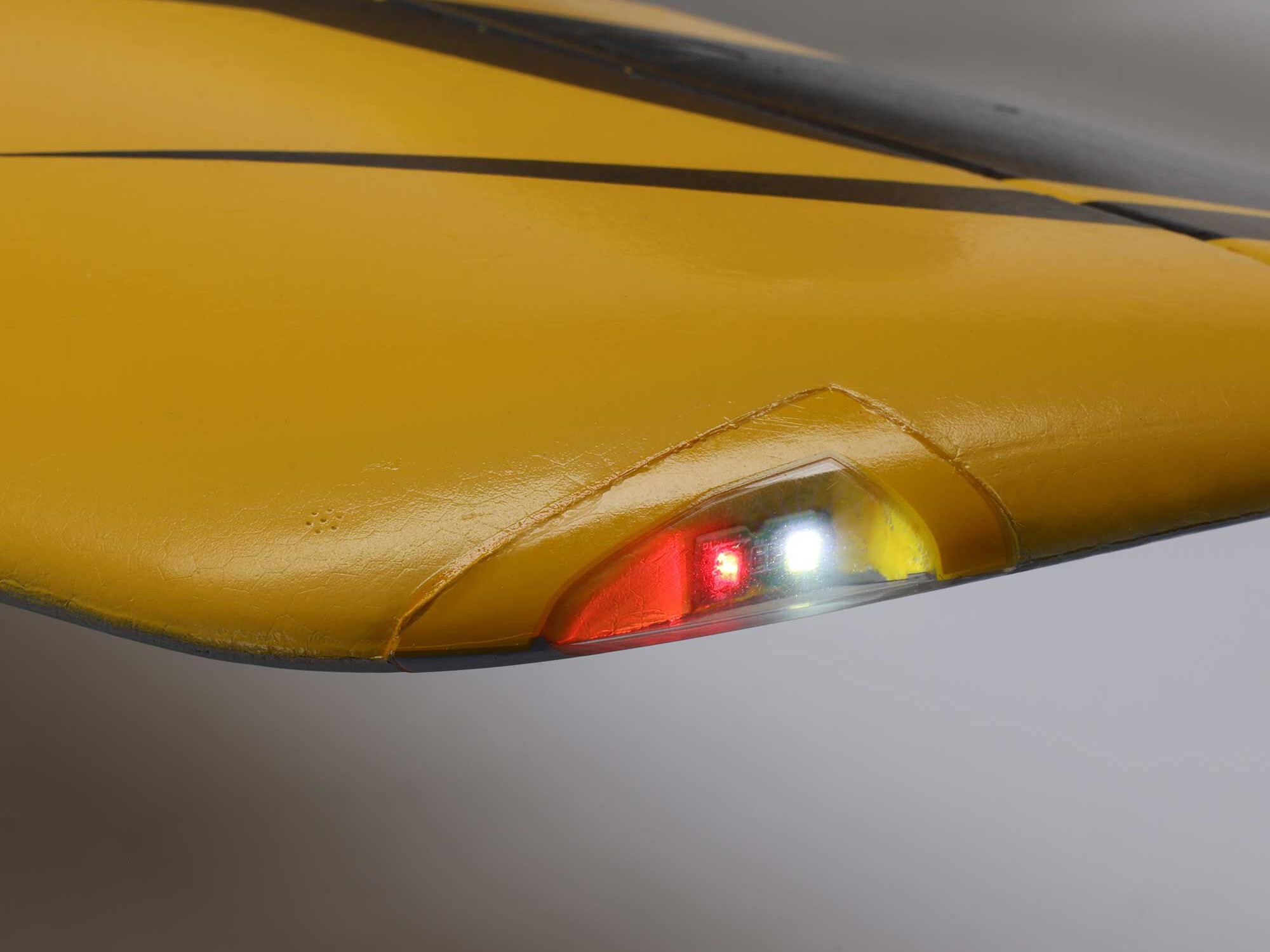 No glue is required for assembly, and the factory-finished one-piece wing, separate one-piece stabilizers, and fuselage bolt together so the Habu XS can be ready to fly in almost no time. The lightweight, composite-reinforced EPO airframe is factory-finished in a premium, fully painted trim scheme, while the plastic-capped hatch edges and opening improve durability to prevent damage and paint chipping when installing/removing batteries. Eight factory-installed digital, metal-geared servos with ball-link equipped linkages, plus control surfaces with unique captured rod hinges, deliver crisp and precise control at every speed. Functional features include LED landing and navigation lights, extremely effective flaps, and electric retracts with shock-absorbing, trailing-link struts on the nose and main gear so you can easily fly from grass and other surfaces.