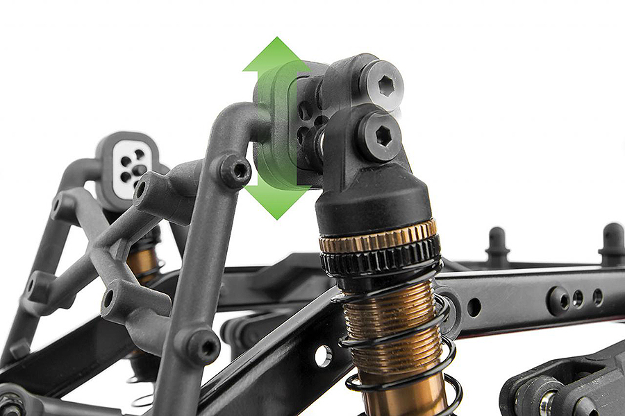 GKSTM shock mount inserts provide drivers with the ability to tune shock angle, droop, and vehicle ride height without affecting spring preload.