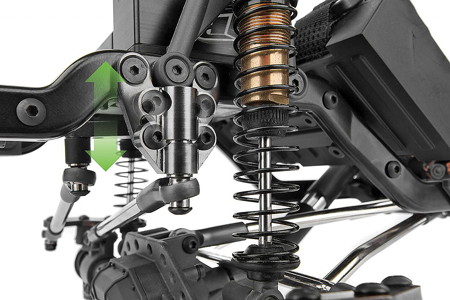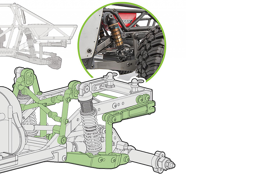 At the heart of the Gatekeeper Suspension (GKSTM) are the rear trailing arms. This design moves the shocks forward, thus improving weight bias. Because the shock mounting points are farther forward on the lower links and chassis, it allows for a larger window for shock tuning and an optimized anti-roll bar mounting position.
