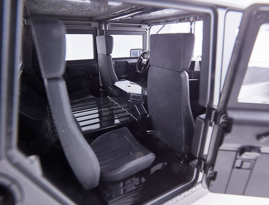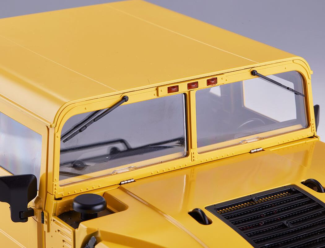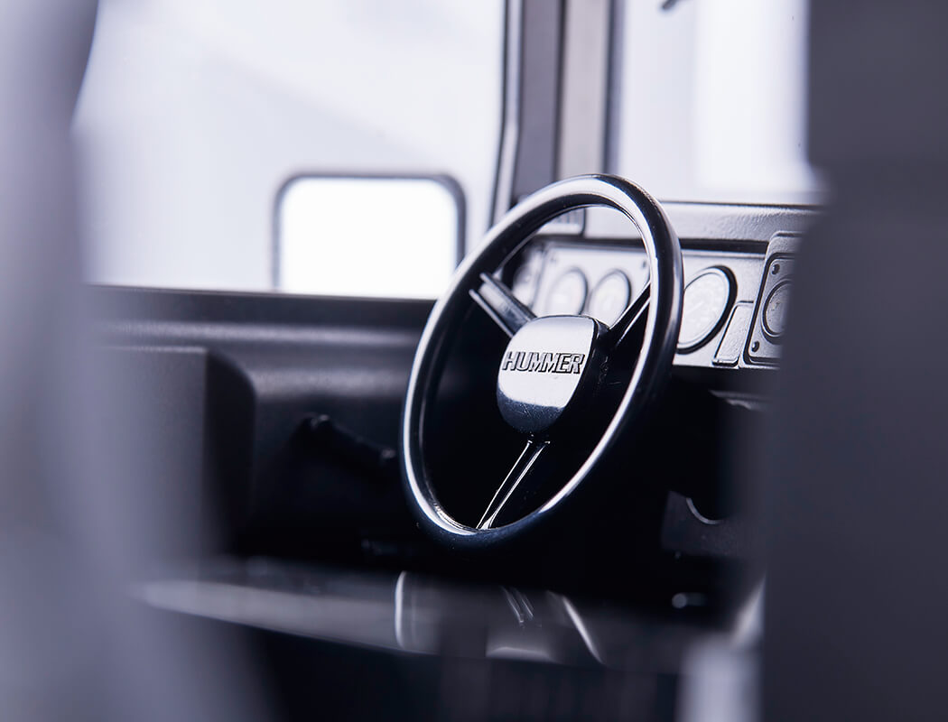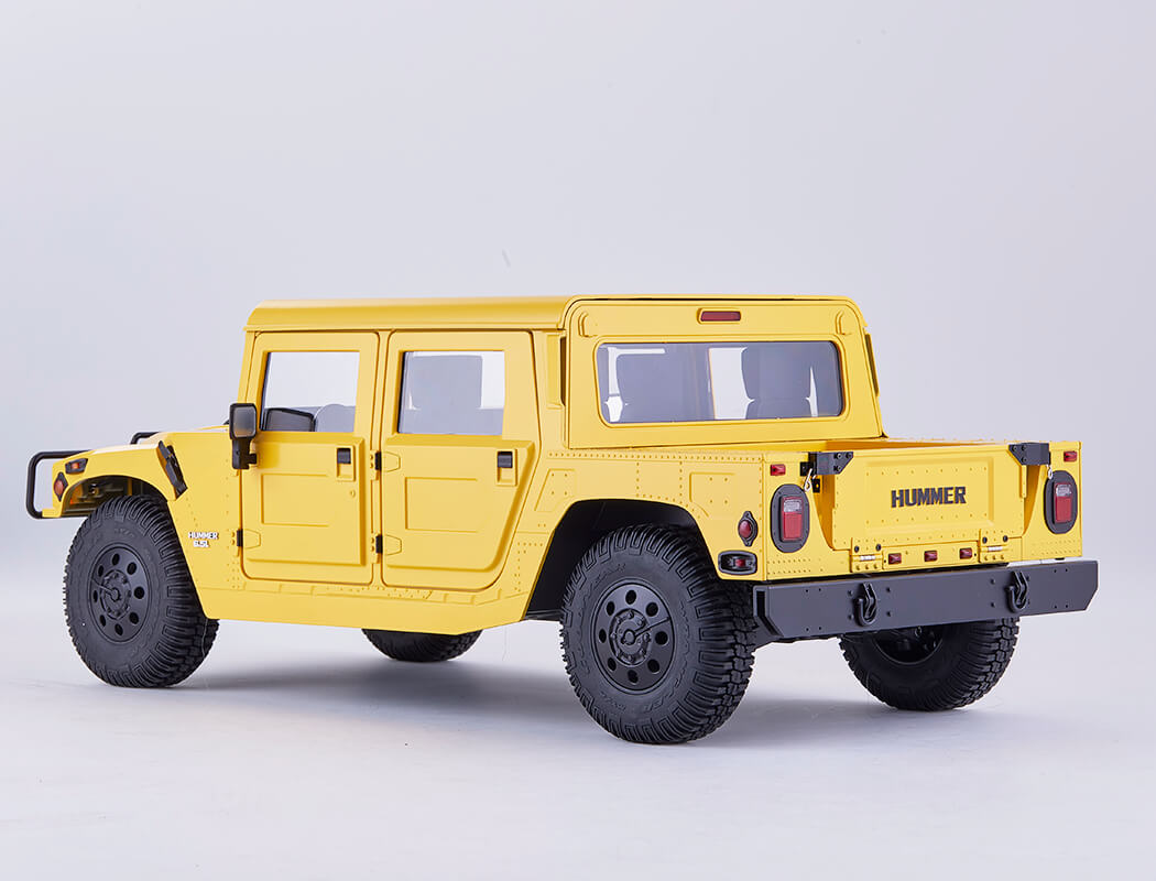 The durable, multi-purpose Hummer H1 has been faithfully recreated in 1/12 scale by FMS! Officially licensed by GM, this realistic masterpiece features a scale suspension system coupled with a two-speed, 2WD/4WD metal-geared drivetrain that can be remotely shifted on the transmitter. Differential lock allows the Hummer to powerfully tackle tough climbs with additional ground clearance provided by the portal axles. An operating steering wheel accents the realistic interior, with operating door latches, removable roof, folding windscreen, and more. A transmitter-controlled front/rear/all-wheel steering function makes this model uniquely maneuverable and fun to drive, while the included 20-LED light set provides yet another layer of realism. The hood even unlatches to reveal a scale engine whose fan assembly operates when the model is turned on!