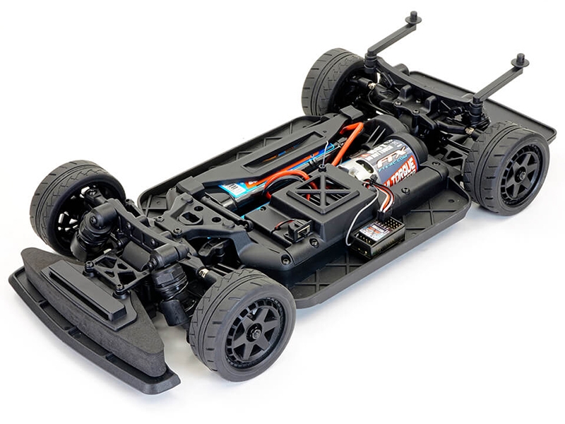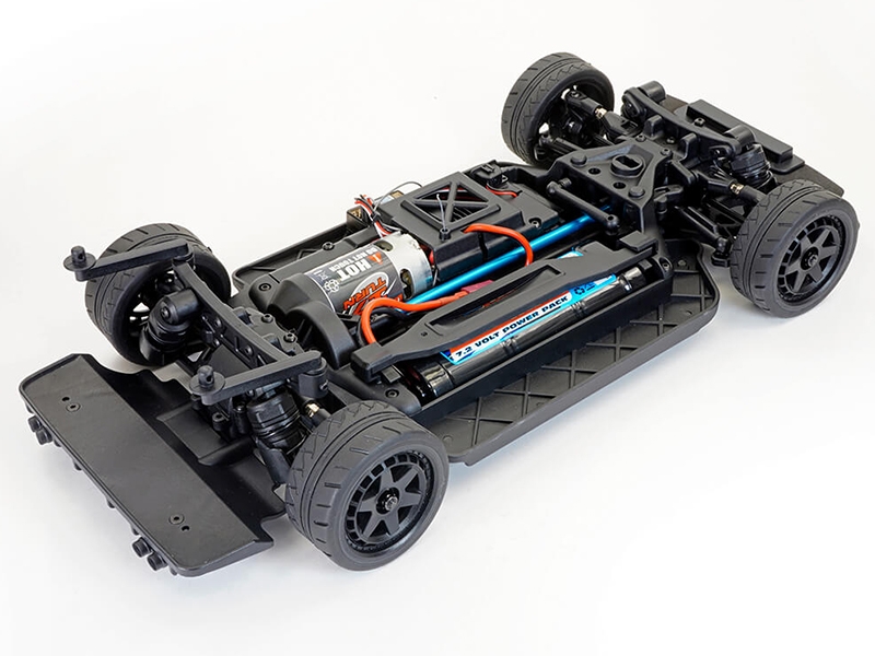 Oil filled shock absorbers, anti-roll bars and adjustable double wishbone suspension lets you tweak to suit your settings and tyre choice; either treaded rubber tyres for street racing, featuring 25mm wide front and 30mm wide rear for better stability at high speed or hard plastic boots on 6-spoke wheels for sideways drift driving.