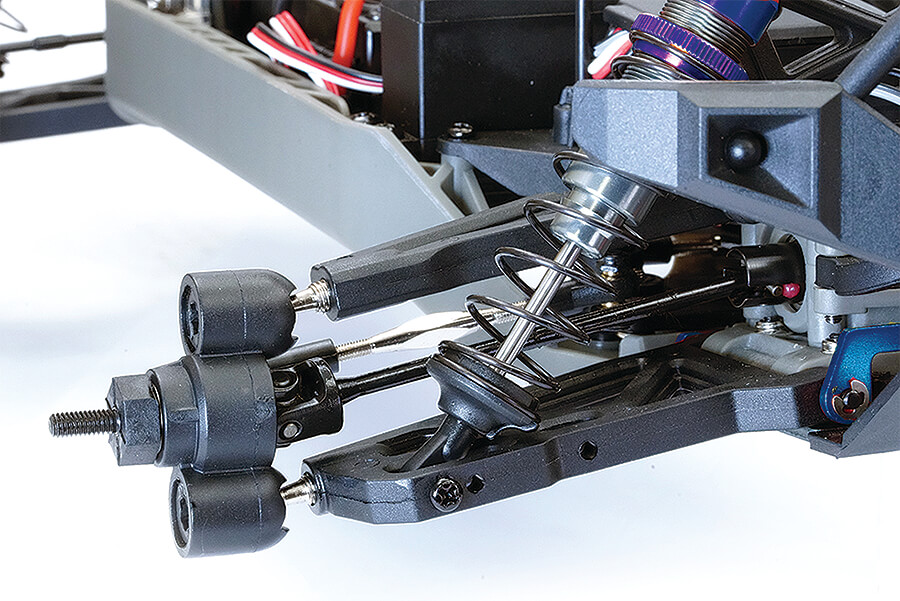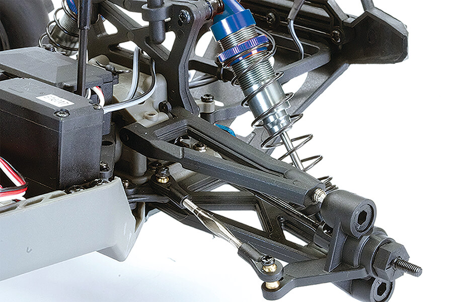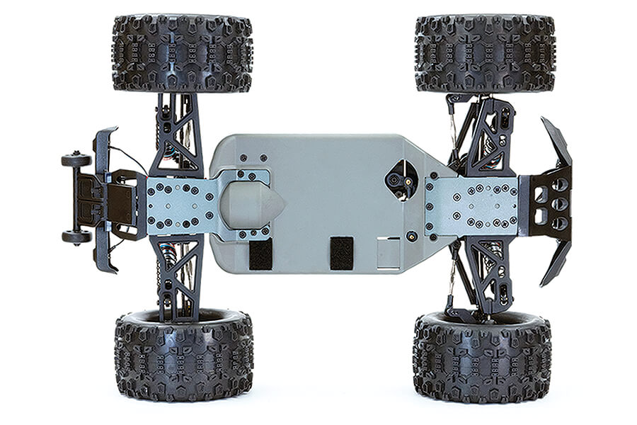 Oil filled aluminium shock absorbers along with a raised high clearance main chassis, with aluminium front and rear skid plates glide over most terrain effortlessly. Should you take a tumble, shock absorbing bumpers and moulded body roof and tail skid bar rails help protect from heavy damage when possible.