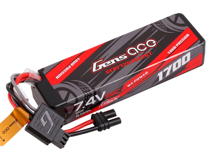 The Gens ace 1700mAh 7.4V 35C 2S Hardcase Lipo Battery with a patented iEC2 plug is specially designed for Arrma Grom Series, Losi NASCAR, and other mini scale vehicles.