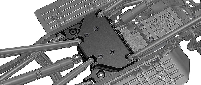 Komodo double cab’s steering system has a steering servo on the frame just like a 1:1 real car. It is designed to make it as closed to the zero bump steer so bump steer movement does not appear by front wheel suspension movements, so we ended up with maximizing the steering performance of the vehicle. In addition, the Panhard-bar is designed to avoid interference with nearby parts, so that the front suspension and shocks can move freely without any loss.