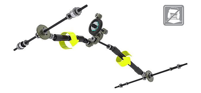 The drive lines of the front and rear axles are arranged in straight-line to reduce the fatigue stress of the universal shaft and reduce the loss of driving power by providing efficient driving lines.