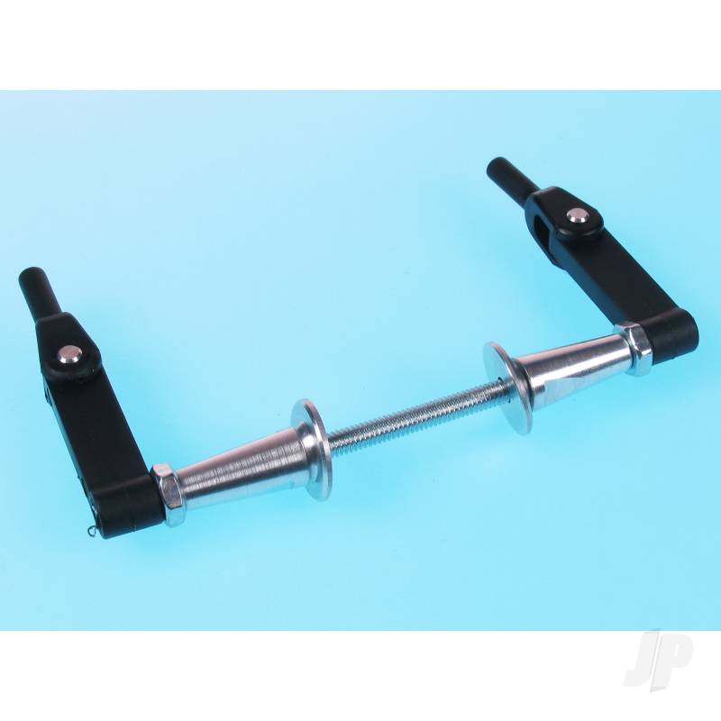 For large aircraft .91 and larger, comes complete with high quality aluminum horns, washers, steel 8-32 long shaft, nuts, horn arms, and clevises (for 4-40 rods) with aluminum pivot pins. 2/pkg.