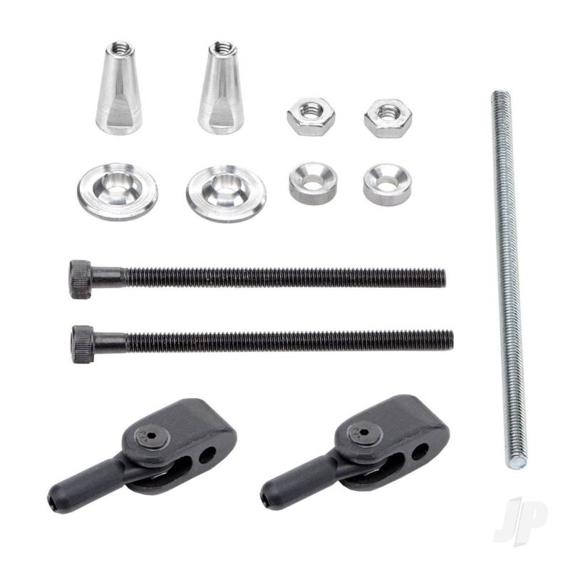 A complete mounting system for large aircraft that can be configured as a pull-pull or as two single control horns. Self-adjusting design will mount at 90 to center line of the control surface. This system includes premium socket head bolts which provide a non-slip head while installing horns. The clevis horns include 4-40 heavy duty swivel ball links for “no-slop” precision control. 1 set/pkg.
