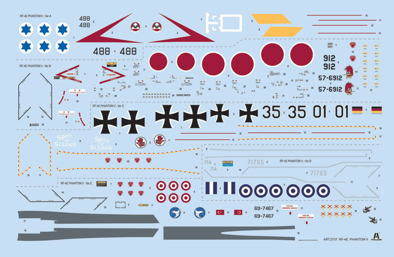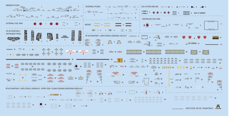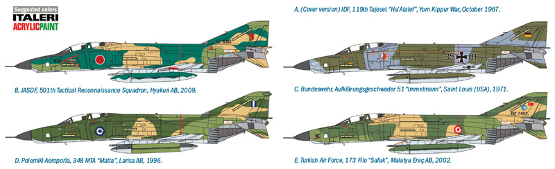 The RF-4E was the unarmed reconnaissance version of the famous Mc.Donnell Douglas two-seats fighter F-4 Phantom II. It was designed and developed for export and it was the combination of reconnaissance system of the RF-4C with the airframe and the powerful engines of the F-4E . The German Luftwaffe received the first samples in the early 70s and became one of the main users along with Japan, Iran, Israel and Greece. Further more many components and reconnaissance systems were also manufactured in Germany. The RF-4E was able to carry out reconnaissance missions “all-weather” in a very effective way thanks to the cameras installed in the bays, the infrared sensors, and the target looking radar system. Some Countries developed specific versions more in line with the specific operational use. The Israelis RF-4E, for instance, has been upgraded in avionics and were able to carry air to air missiles as Sidewinders or Pythons.