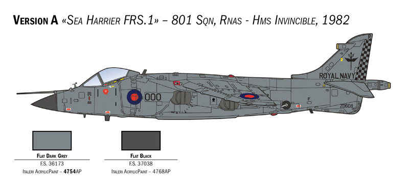 The British Aerospace Sea Harrier was a VTOL / STOVL (Short take-off and vertical landing) capable fighter, developed to equip the air arm sections of the British Royal Navy. It entered into service during the late ‘70s and early ‘80s with the main operational role of fleet air defence aircraft. In 1982 it was deployed on HMS Invincible and HMS Hermes during the Falklands war, fully demonstrating its operational effectiveness during the conflict. Unable to match the speed and flight characteristics of opposing aircraft such as the Mirage 111, it was nevertheless extremely manoeuvrable and reliable in all operating conditions. The Sea Harrier was equipped with an effective offensive armament capability, consisting of two 30mm ADEN guns installed in pods under the fuselage and by 4 sub-wing hardpoints to launch air-to-air missiles.