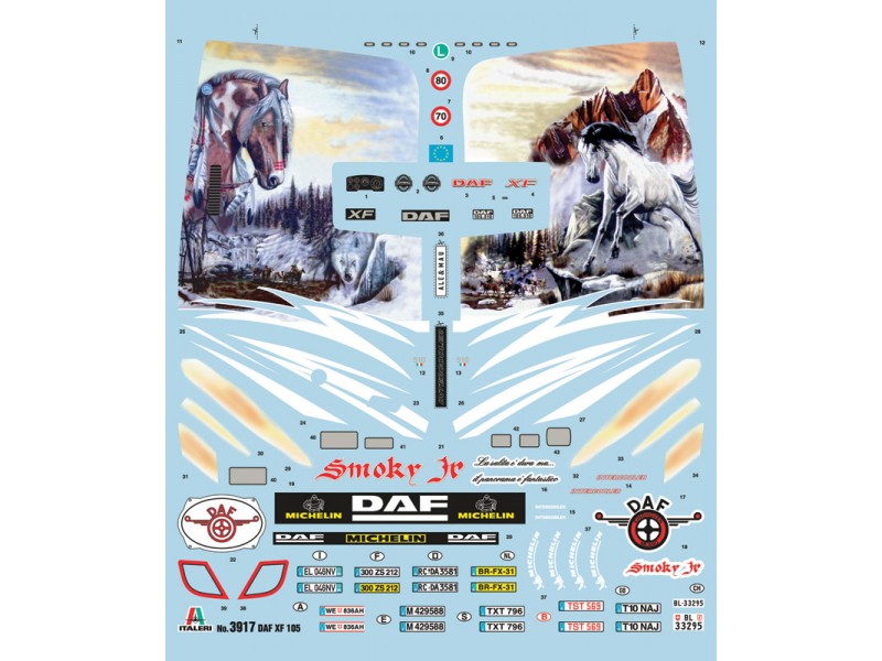 This road haulage tractor by DAF is a restyled version of the successful previous series. Offering excellent reliability and a good standard of comfort on long-haul routes, the XF105 also features very good mechanical reliability and outstanding tengine performance under a wide range of conditions, in full compliance with the strictest environmental standards. Also, in the event of an accident, the cab provides the driver with an extremely high level of protection. The name “Smoky” comes from the race horse owned by the driver father (from here “Junior”) which, used to winning, during the race was disappearing like a puff of smoke in front of his opponents. In a Wild West atmosphere, the horses are the protagonists in the airbrushed sides of his DAF XF 105 too.