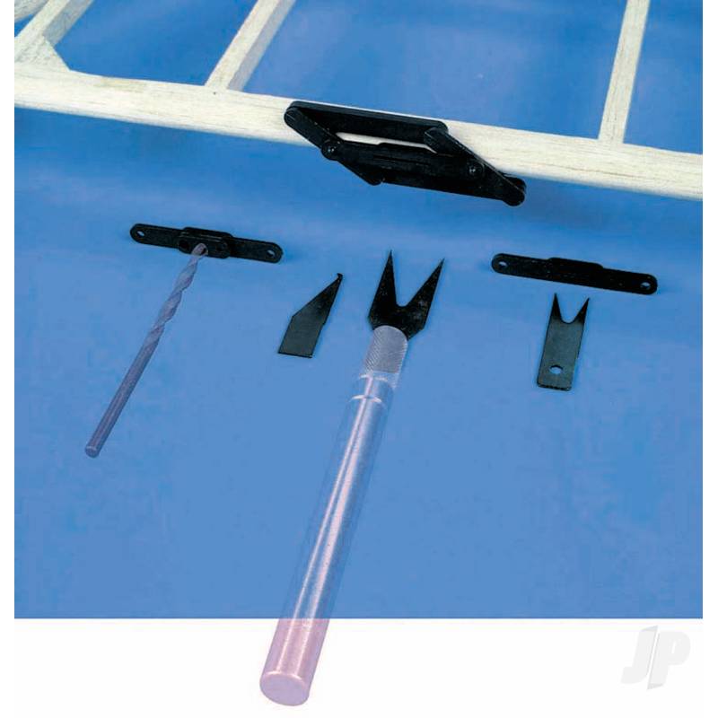 This Kwik-hinge Slotter centres and acts as a guide for perfectly aligned slots for any hinge. Blades fit No 2 type handles. Includes 3 snap-on jig guides for hole centring, mini hinges and large hinges. Drill and handle not supplied.