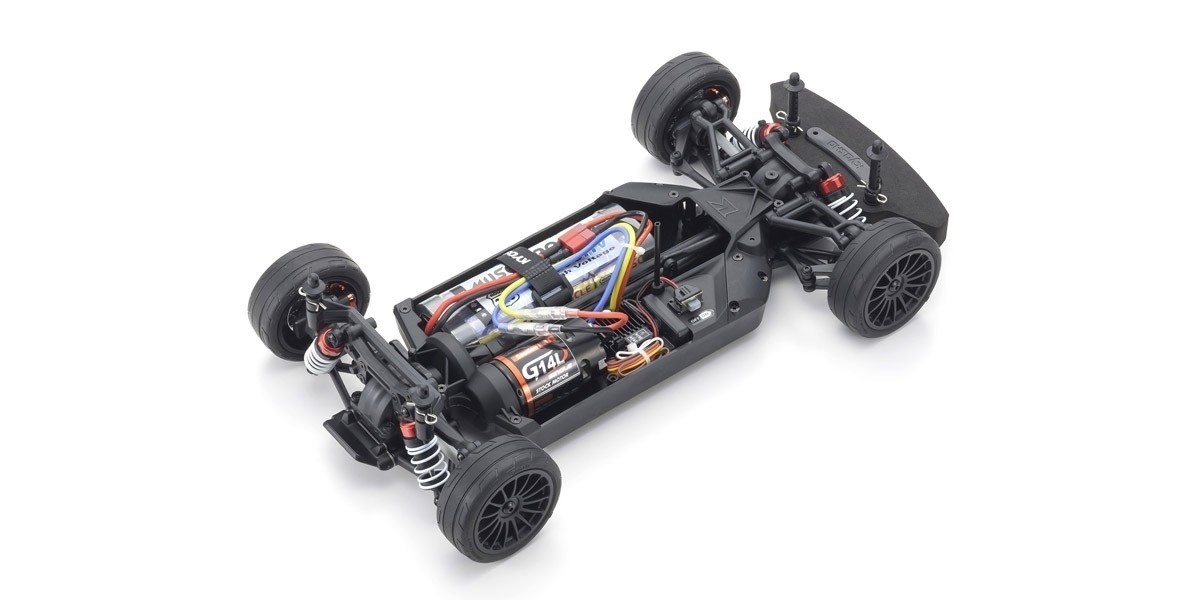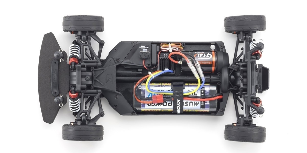 For the pure enjoyment of R/C car driving, the combination of a beautifully reproduced car body with the FAZER series chassis can’t be beaten. Kyosho has taken its standard touring car chassis and given it a full model makeover that has evolved performance to a new level. A simplified design with fewer parts has improved maintenance efficiency and reduced weight while core strength and rigidity has been increased through new materials and ribbing and stiffeners on front and rear. In addition, the symmetrical chassis design synergizes excellent front-rear balance through the suspension with responsive control, irrespective of power source. Featuring slipper clutch, front & rear gear differentials, oil shocks and full ball bearing specs, the high durability and impact resistance allows drivers to unleash the full potential of the chassis. Brake disc wheel hubs with two different offsets (0mm, +5mm) provide compatibility with 190mm and 200mm width body styles and allows the wheelbase to be adjusted to 274mm by replacing some parts (sold separately) for compatibility with other 1/10 scale body styles, in addition the body included. The Readyset package comes fully assembled and includes everything except charger and battery for the chassis, and batteries for the transmitter.