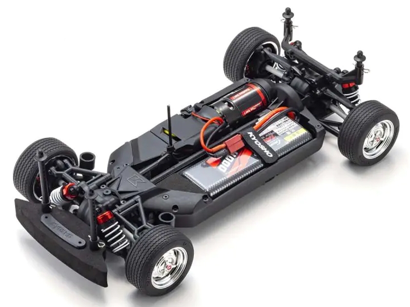 For the pure enjoyment of R/C car driving, the combination of a beautifully reproduced car body with the FAZER series chassis can’t be beaten. Kyosho has taken its standard touring car chassis and given it a full model makeover that has evolved performance to a new level. A simplified design with fewer parts has improved maintenance efficiency and reduced weight while core strength and rigidity has been increased through new materials and ribbing and stiffeners on front and rear. In addition, the symmetrical chassis design synergizes excellent front-rear balance through the suspension with responsive control, irrespective of power source. Featuring slipper clutch, front & rear gear differentials, oil shocks and full ball bearing specs, the high durability and impact resistance allows drivers to unleash the full potential of the chassis. Brake disc wheel hubs with two different offsets (0mm, +5mm) provide compatibility with 190mm and 200mm width body styles and allows the wheelbase to be adjusted to 260mm by replacing some parts (sold separately) for compatibility with other 1/10 scale body styles, in addition the body included. The Readyset package comes fully assembled and includes everything except charger and battery for the chassis, and batteries for the transmitter.