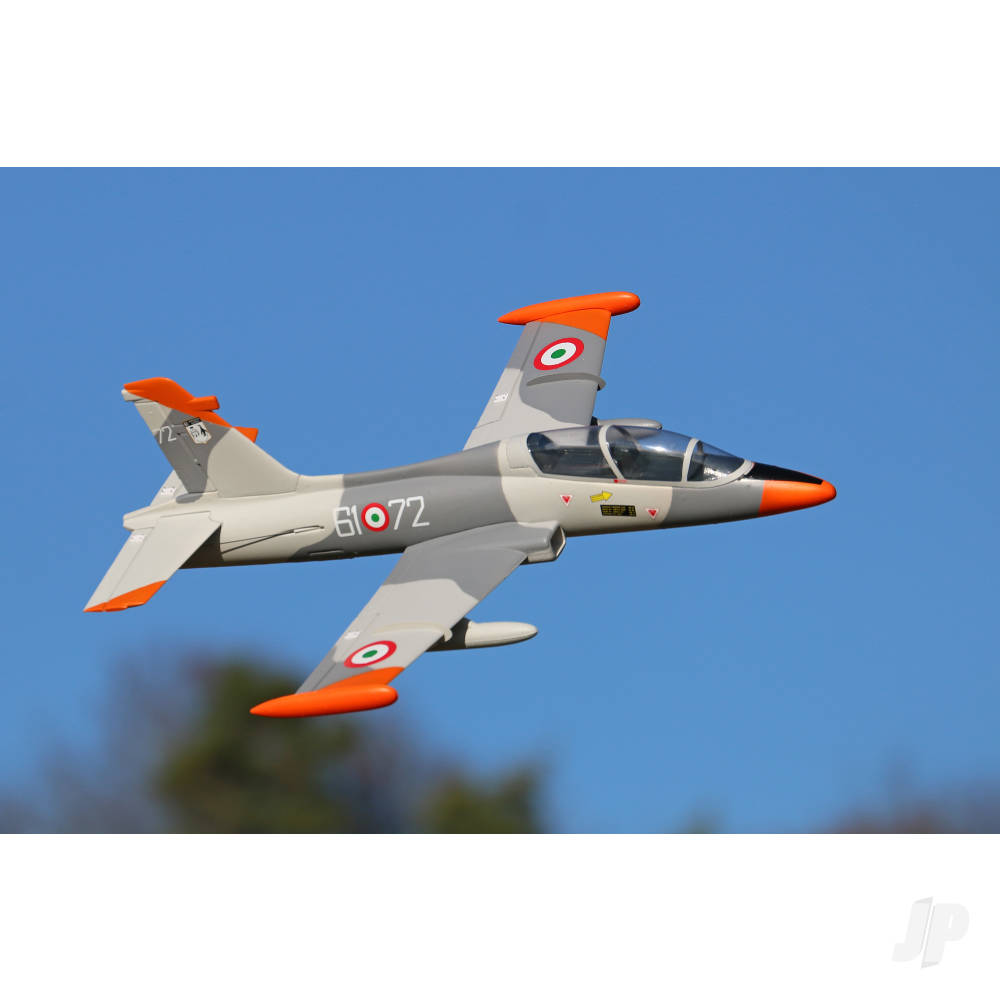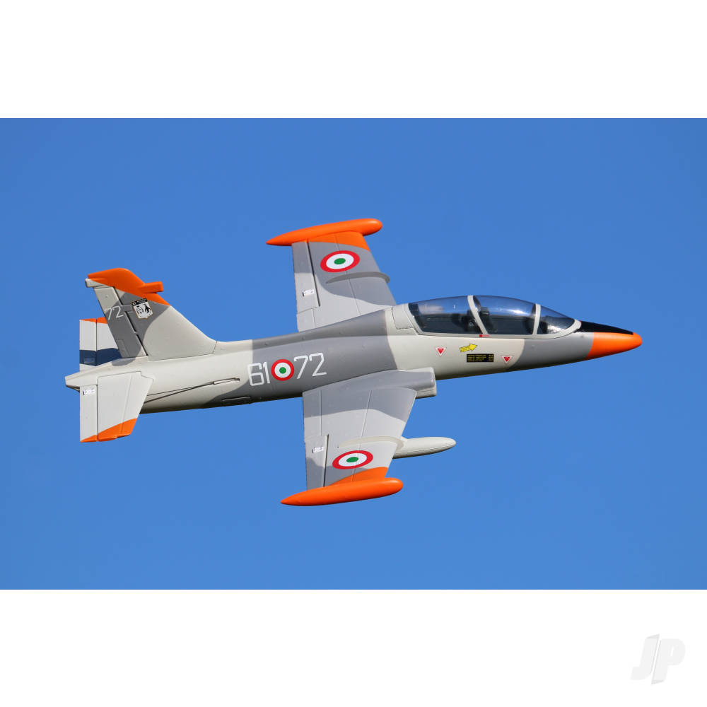 If ever a jet were perfectly designed for miniaturisation and conversion to R/C, Aermacchi’s MB-339 would have to be up there with the best of them. Designed as an advanced trainer and light attack aircraft the ‘339’s inherent qualities are brought to the fore in this smooth-flying, lightly loaded, 800mm span EPO EDF jet. But that’s just a hint of the characteristics that make this a model you’ll want to own and fly frequently. Fuelled by a standard – cheap as chips – 3S 2200mAh LiPo, its 50mm 11-blade fan and precision 2627 4900KV brushless motor combo produce thrust enough for genuinely spirited flight and a vertical performance that’ll make you grin from ear to ear. Take all this, add a fool-proof hand-launch capability, a benign stall, transport convenience and a colour scheme that quite literally turns heads, and what you’ve got here is a perfect first, second or third scale jet for any intermediate or advanced pilot.