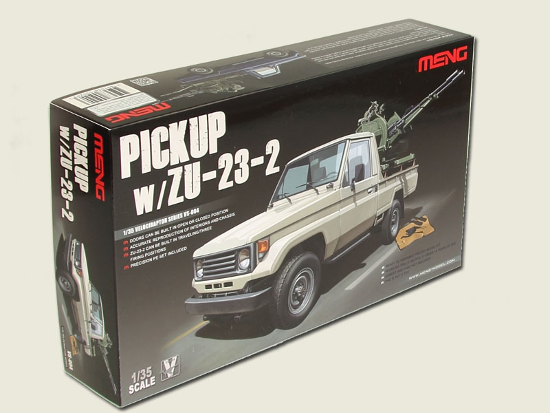 Pickup, a light truck with open cargo bay, has gained universal utility in many fields, including military applications. The ZU-23-2 AA gun, developed by Former Soviet Union, is a light-weighted, easily operated and low cost weapon system widely adopted by many nations and has seen active performance in hot spots in Africa and Middle East. Due to its nature, this gun can be fitted onto various platforms as a highly effective mobile fire support weapon. Model Information: This 1/35 scale plastic kit of Pickup w/ZU-23-2 is a faithful replica of the real vehicle with accurate outline as well as interior details and optional door positions. Complex structure of ZU-23-2 AA gun is also accurately modelled with travelling/three firing positions available. Precision PE set is included. Two painting schemes for the Pickup are provided. Dimensions: Length: 140mm Width: 57mm