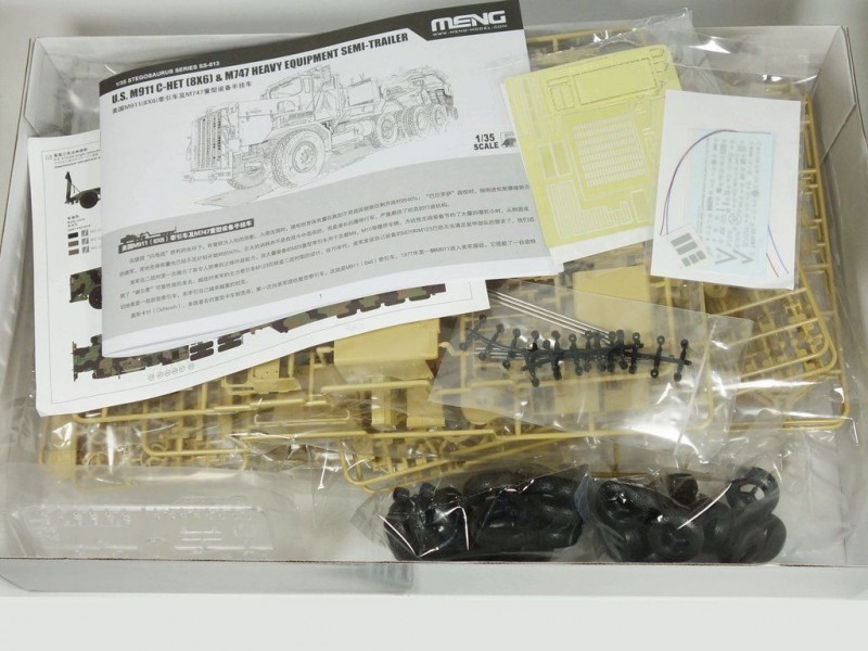 The MENG SS-013 M911 C-HET (8X6) & M747 Heavy Equipment Semi-Trailer model is 571.2mm long and 99.9mm long. This kit contains 843 parts. It features complete cab and power system interiors. Some wheels are connected by metal axles with fine details. The trailer loading ramps are movable. The tractor’s front wheels can be made in a steering position. Precision PE parts, reflective foil and mask stickers for cab windows are included in the kit. You will need this behemoth for the cold war tank models in your collection!