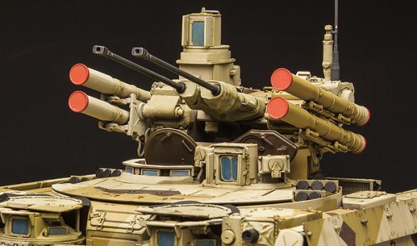 The Russian BMPT Terminator fire support combat vehicle is a high manoeuvrability multi-purpose tracked combat vehicle. It is based on the chassis of the T-90A tank. 30mm automatic guns, 7.62mm machine guns and anti-tank missile system are mounted on the turret. Mounted on both fenders of the front hull are two 30mm grenade launchers; explosive reactive armour modules are fitted on the front and both sides of the hull; there are five crew members. It can coordinate with any tanks in battles in different geographical conditions. Its advantage is particularly prominent in the urban battles.