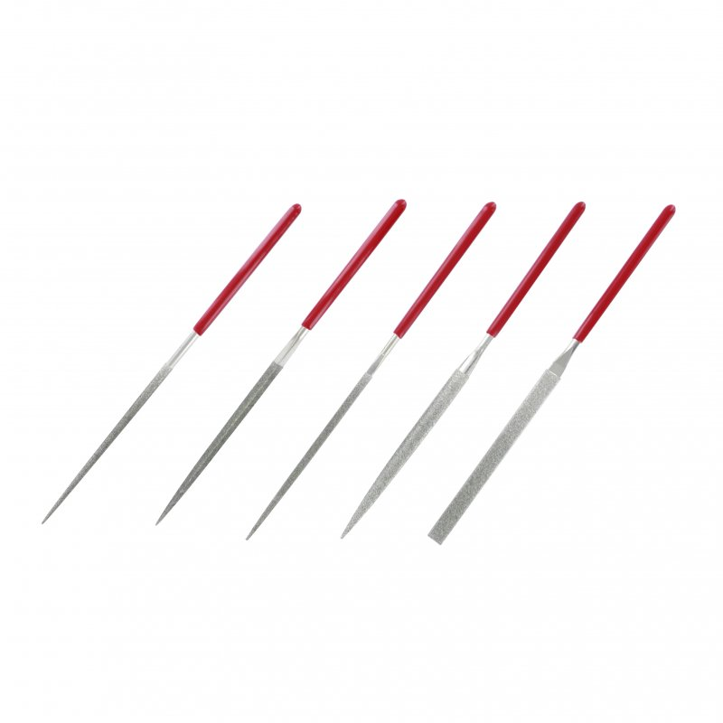 The diamond needle file set includes 5 profiles, flat, square, round, half round & triangle. These 140mm tools are excellent for precise filing tasks in plastics and metals. Longer lasting and faster working than conventional files.