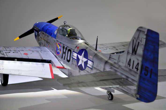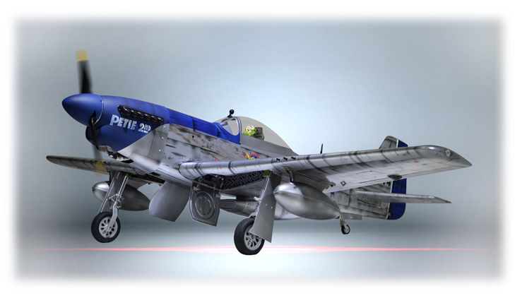 For the ultimate, realistic flight experience, the P-51 comes with all-metal mechanical spring-loaded strut assemblies. The P-51 comes out of the box with all kinds of details that have been finished for the consumer, including a factory-painted fiberglass cowl, scale antenna, scale-shaped spinner, and much more. For a high-quality outer surface and realistic appearance.