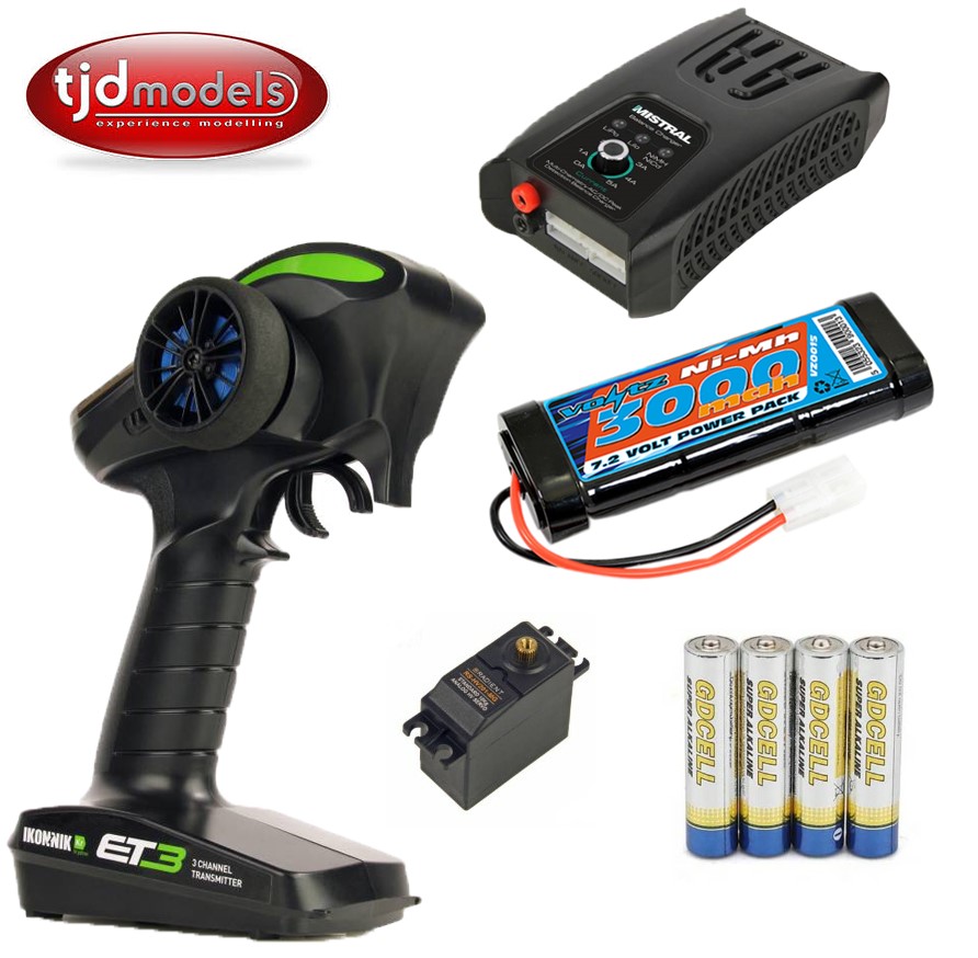 This starter deal is ideal for Tamiya/Kyosho electric self build kits. The deal contains the radio equipment, a longer lasting battery and a fast charger, and upgraded steering servo with AA batteries for the handset.