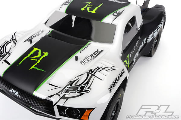 This is a Flo-Tek Clear Body for Slash, Slash 4X4, SC10, XXX-SCT, Ten-SCTE, Ultima SC and Blitz. Introducing the first SC body specifically designed to minimize the short-course body parachute effect! If you have ever raced or bashed a short-course truck, you know that SC bodies act like parachutes when going over jumps, causing you to lose control and crash. Pro-Line’s new Flo-Tek SC body features futuristic styling coupled with large vent holes that allow air to flow through eliminating aerodynamic drag. The locations and size of the vents were designed to maximize air flow through the body while keeping the aggressive and high-tech look. Don’t get caught in the wind while the competition passes you by Get Pro-Line’s new Flo-Tek SC body today!