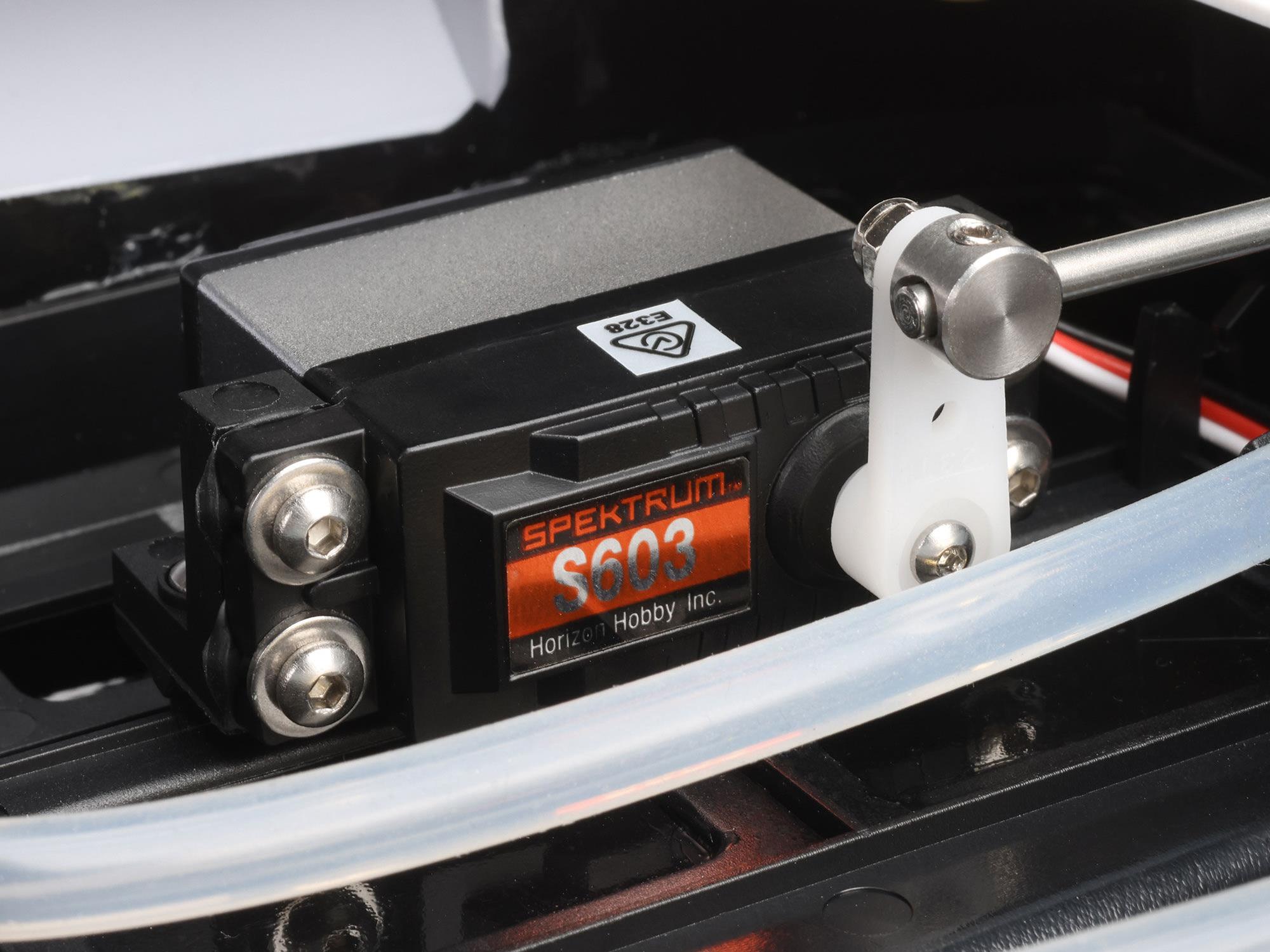 When you’re running on water, chances are good a small amount will get into the hull. Spektrum receivers are water resistant, but the exposed pins that accept servo leads are susceptible to connection issues if they do become wet. The Blackjack 24″ catamaran includes a receiver box that locks out moisture and keeps this critical component safe and dry.