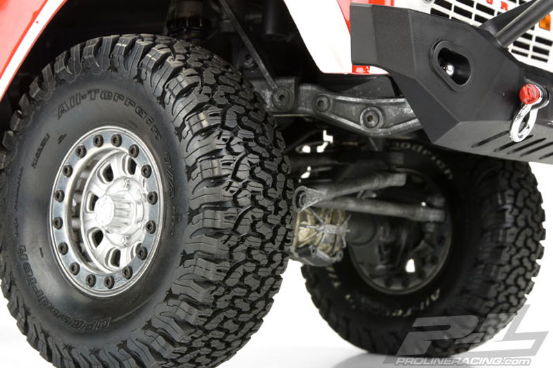 Pro-Line is proud to announce a partnership with the leading full-size Off-Road tyre manufacturer – BFGoodrich®! This collaboration started with the introduction of the full-race BFGoodrich® Baja T/A KR2 tyres and continues with the extremely popular BFGoodrich All-Terrain KO2 tyres available in Pro-Line’s legendary G8 compound! Details from the full-size race All-Terrain tyre have been recreated to give your truck the ultimate in scale look and multi-surface performance. Known for extreme off-road traction and awesome street performance in the full scale world, the BFGoodrich All-Terrain KO2 tyre features an iconic layout of densely packed tread blocks with a large number of tread sipes that will give your rig improved traction on any terrain! Pro-Line engineers decided that the KO2 tyre needed to be 4.35” tall x 1.42” wide for the perfect balance of Scale looks and performance!