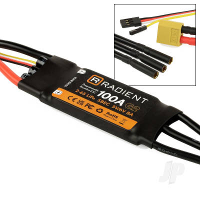 Radient’s 32-bit programmable ESCs, each with multiple protections, super-smooth start-up and an ultra-reliable low heat generation MOSFET have been designed to comprehensively satisfy the needs of practically all R/C pilots no matter what they fly. Featuring an adjustable SBEC output voltage, the 40, 50, 60, 80 & 100A controllers offer the added benefit of maximising the voltage that drives your servos and, by virtue, the performance thereof. In addition to their high build quality, light weight and compact size, these feature-rich ESCs offer wide-ranging motor compatibility and are perfect for all club pilots who fly sport, aerobatic and scale aircraft and seek a trouble-free fit-and-forget solution to motor control.