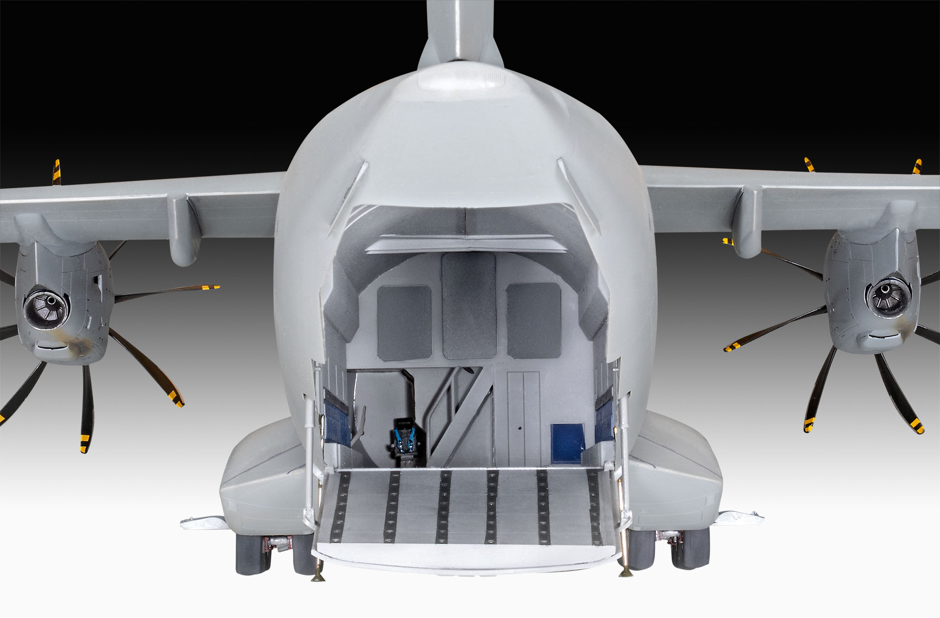 This detailed model of the modern A400M cargo and transport aircraft with a length of 644 mm and a wingspan of 590 mm offers a special model building experience. With 212 individual parts and an authentic representation of the Spanish Air Force and the British Royal Air Force, this model is a must-have for collectors and fans. The recessed sheet metal joints, the detailed cockpit, the optionally open or closed rear ramp and the structured loading bay make assembly a special experience. The enclosed decals give the model the finishing touch.