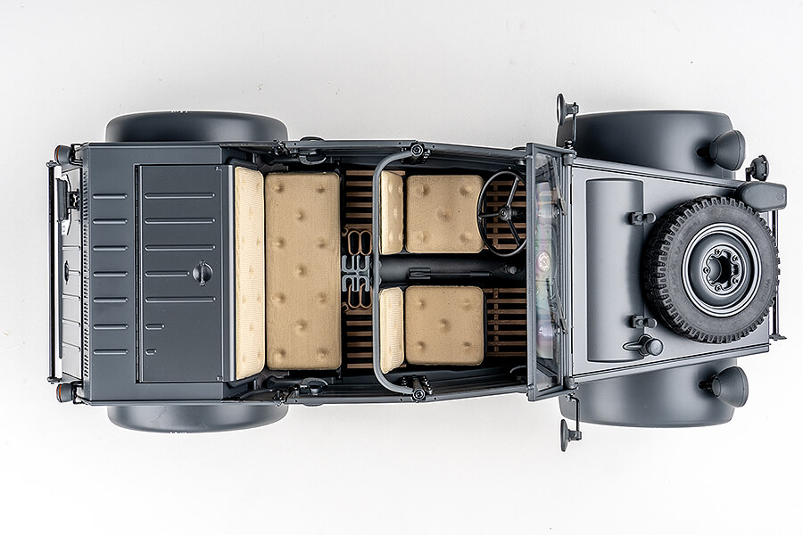 The car body, on which the R&D team spent the most time on you can see the Bosch horn and headlights and Notek camouflage lights. The tires are the most common 5.25×16 as used on the barrel car. Like the real car, the simulated wheels need to be fixed with 5 screws, with a full function installed spare on the front hood, ready for use if called upon. Remove the spare tire and the typical mid-cycle spare tire bracket is readily accessible. The windshield can be moved down and fixed on the front bracket and the real rearview mirror’s angle is adjustable just like a real car.