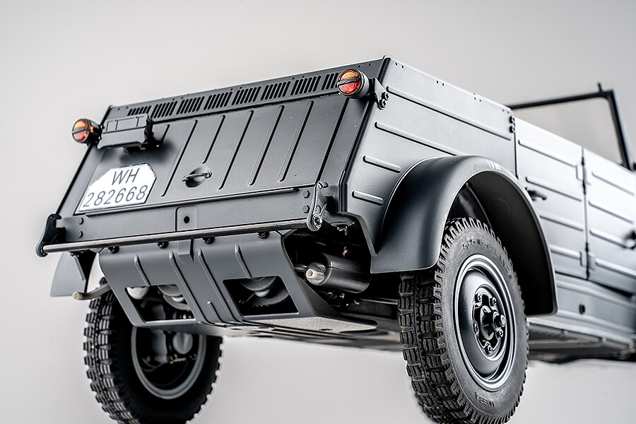 Having already released the Allied Jeep, it felt only right to deliver the Axis equivalent in the form of a 1/12th scale Kübelwagen Type 82. The rear mounted air-cooled engine has been faithfully recreated to mirror the original, an engine that lasted for 65 years in the classic VW Beetle with production finally halting in Mexico, 2003. The 985cc engine was later upgraded to 1131cc, and then gradually increased displacement with the Porsche 356 using a 1488cc engine, doubling the horsepower from the original. The cylinders of the horizontally opposed engine are distributed on both sides, a 130 motor in the right cylinder position, and another 130 motor reserved for the left side, which can output twice as much power when applied to the VW T1 or Porsche 356 platform. The engine crankshaft flywheel is connected by a belt to drive the generator and the cooling fan as well. The semi-circular fan fairing is a major feature, in which the airflow is distributed to the cylinders on both sides. All is restored within the 1/12th model, so that you can observe the blades rotating through the fan intake when the motor is running. The real Kübelwagen had 4 forward gears with the maximum speed when in each gear as follows, 1st gear 18.4km/h; 2nd gear 32.4km/h; 3rd gear 54.2km/h; 4th gear 83.6km/h. The corresponding red line gearshift tips is available on the dashboard. On the model, we designed a 2-speed shift to simulate the speed of the 1st and 3rd gears of the real car. Power crosses over from the top of the rear axle differential and then returns to the rear axle. The model shares the same structure as the real engine, with the benefit of compactness, making it easy to switch between 4WD and RWD modes. This shift function via a simple button on the transmitter is perfectly reproduced on the model to provide more control when driving off-road.