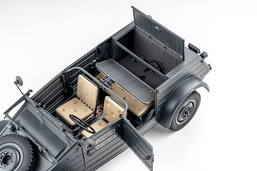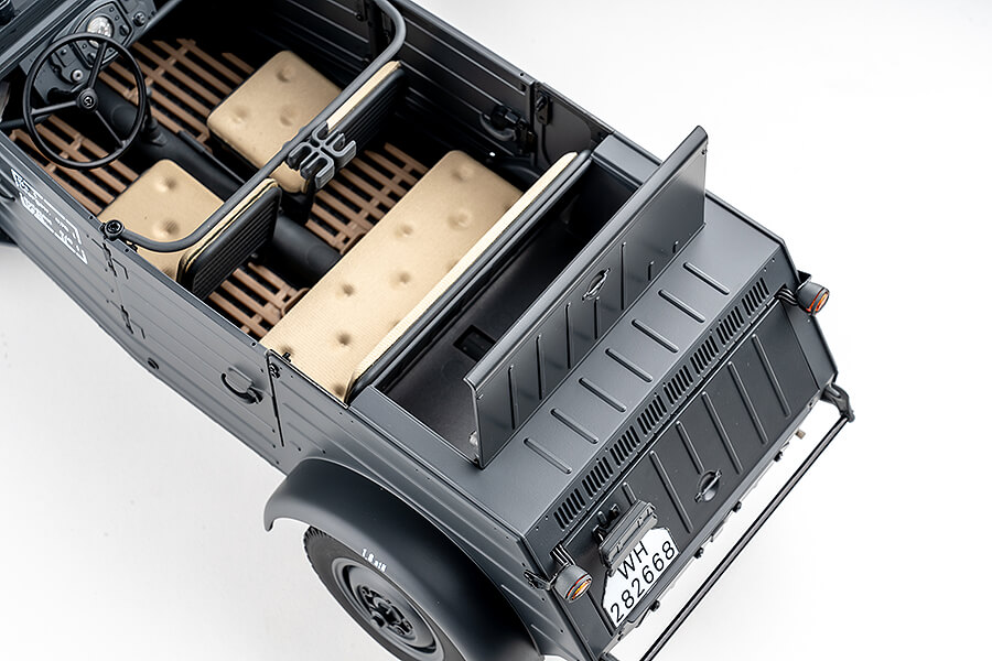The dashboard displays the speed and timing of gear changes with the current mileage 203 km, this being about the distance driven from the Wolfsburg factory to Berlin. No doubt we are selling a new car here. You might find it hard to start your Typ82. Fear not as the start button is mounted on the lower left corner of the dashboard – just press it through the steering wheel. As with other models in the FMS scale range the steering wheel and axle are linked, when you steer the wheels, the steering wheel does the same. With 1/12 figures, a driver can be vividly displayed to add additional realism.