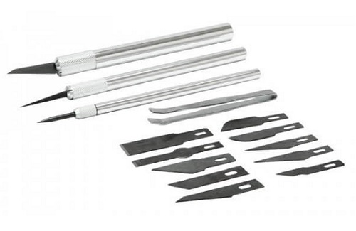 | 17pc Hobby Knife Set Includes 13pc hardened bladesin various shapes, pair of tweezers, and 3 aluminium handles. Suitable for cut, scratch, etch, scrape, layout and model making |