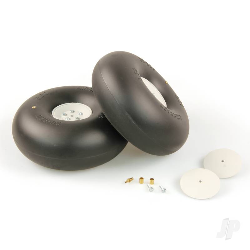 Smooth inflatable tires with positive seal air valves. Features two piece bolt together hubs and hub caps. Wheels can be inflated (or deflated) thru a tiny valve in the side of the tire. Axle diameter size 5/32 (4mm)