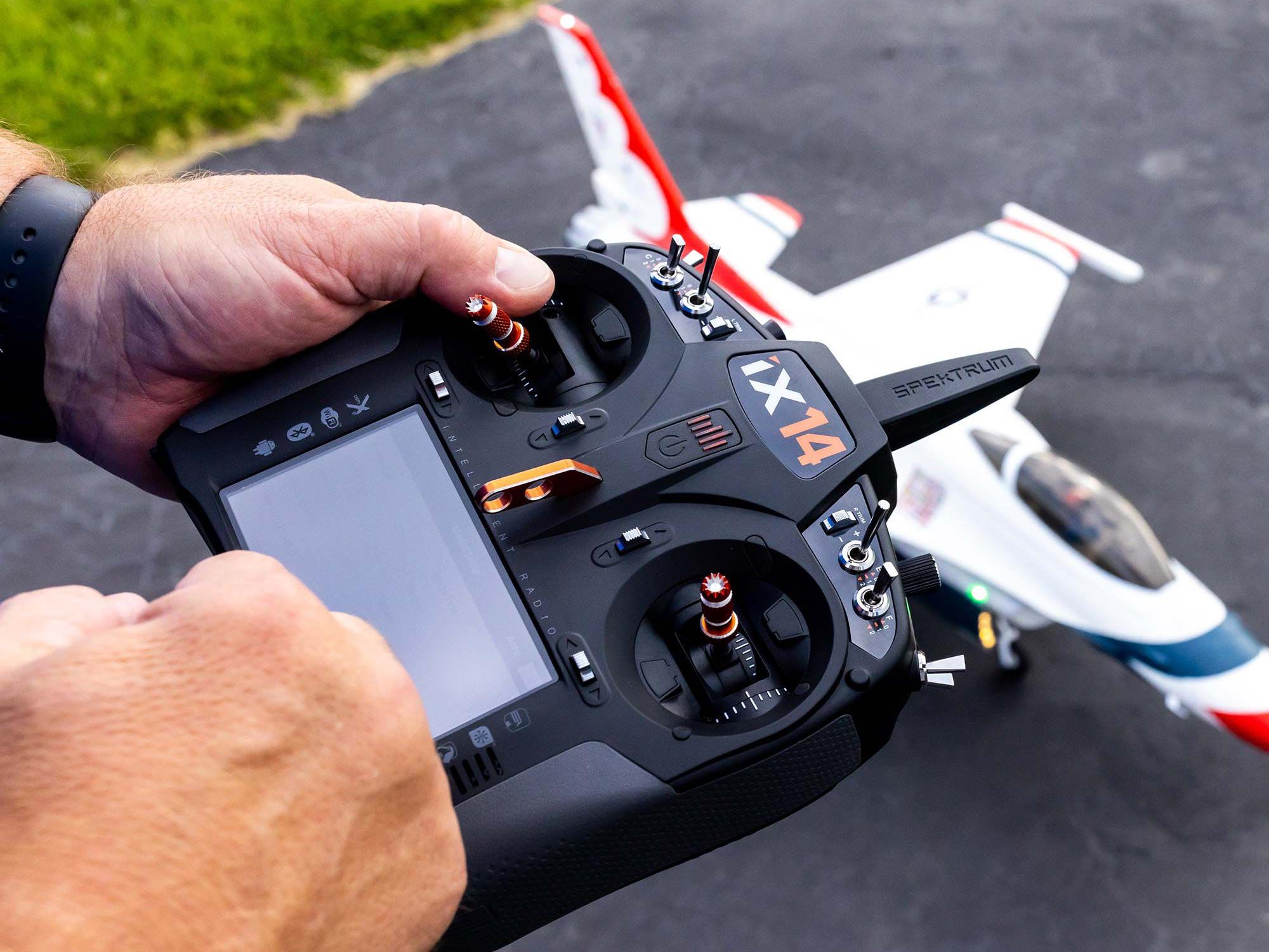 The iX14 now joins the series as the perfect intelligent transmitter for intermediate to advanced level pilots who fly mid- to high-end performance RC aircraft, including EDF jets and giant-scale turbine jets. It offers 14 channels and includes many of the latest Spektrum advances in connectivity, programmability, and ergonomics.