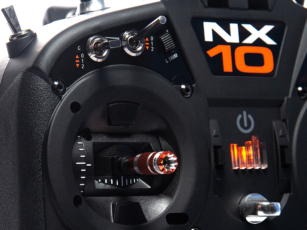 The NX10 transmitter is built around proven Spektrum™ DSMX® 2.4GHz frequency-agile technology — the most advanced spread spectrum RC technology to date. By adding the agility of unique frequency shifts to the superior interference resistance of a wideband signal, and by limiting those shifts to a smaller portion of the 2.4GHz band, DSMX® transmitters provide on-channel interference protection that’s second to none.