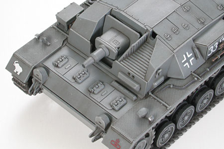 Germany’s versatile StuG III was originally designed as an assault weapon, however also came to be used as a weapon of defense as the war progressed, providing both assault gun and anti-tank support. Based on the durable Pz.Kpfw. III chassis, the StuG III featured a monoblock structure with an L24 75mm short barreled gun mounted directly on the hull, eliminating the revolving turret and reducing overall height. The StuG III’s design allowed the installation of a larger main gun, and led to greatly reduced production costs, making it one of Germany’s most important armored vehicles of WWII. The Ausf. B was the first truly mass produced StuG III with over 250 produced from June 1940. The Ausf. B saw action during the Balkans campaign in April 1941 and Operation Barbarossa in June, 1941, and was widely respected for the reliable direct fire support it provided, and for its ability to face formidable Soviet tanks.